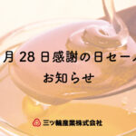 2022.03.28 / 最終更新日 : 2022-03-28 aitechcamp お知らせ みつばち感謝の日セールのお知らせ 現在三ッ輪産業では「3月28日(みつばち)感謝の日セール」を行っています!普段のセールでは10%OFFのところ、今回はニュージーランド産はちみつが15%OFFです。この機会にぜひお試しくださいませ! 期間:2022年4月 […]